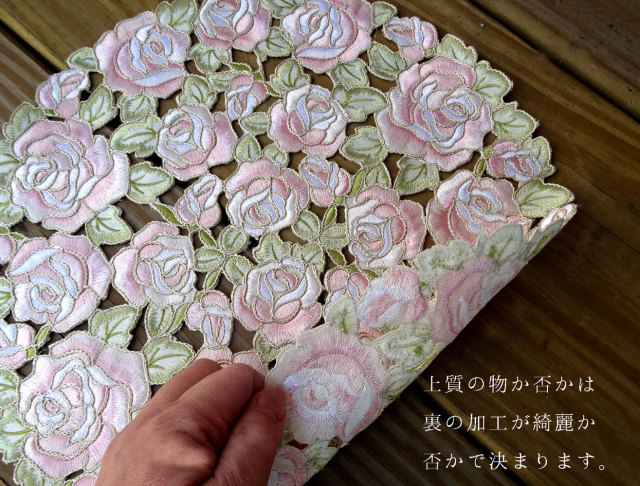 モチーフの上に刺繍を施し、繊細な表情です。