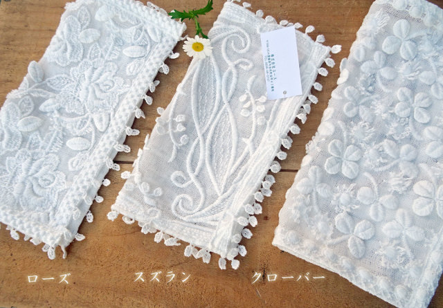 (ハンドメイドの為個体差有ります。ローズとずずらんはレースの両端のサイズです。クローバーは、生地サイズです)