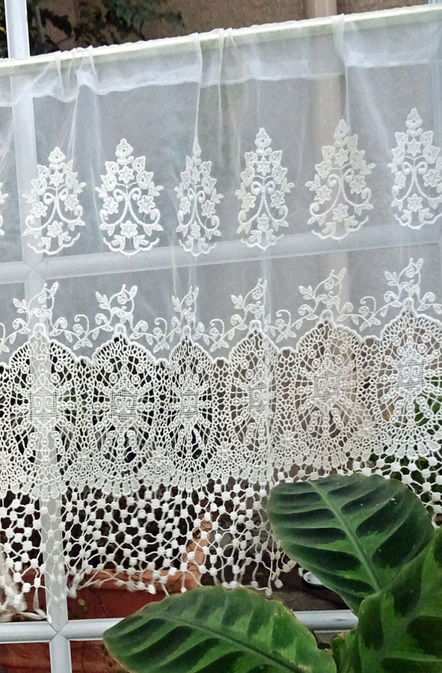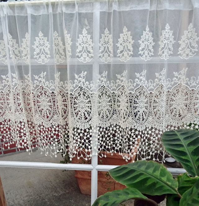 アイボリー色でシャビークラシックなお部屋に馴染みやすい、可愛いカフェカーテンです。